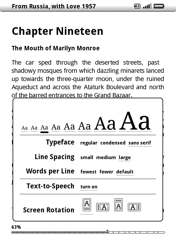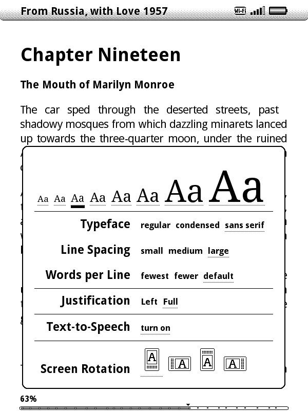 Then access the "com.amazon.ebook.booklet.reader" subfolder and edit the "reader.pref" file (use an editor like editpad pro that preserves unix LF line endings instead of windows notepad which will end lines with CR LF). Set the undocumented option ALLOW_JUSTIFICATION_CHANGE=true Restart the Kindle (home, menu, settings, menu, restart). Now, pressing Aa will show the new justification option. Before/After: |