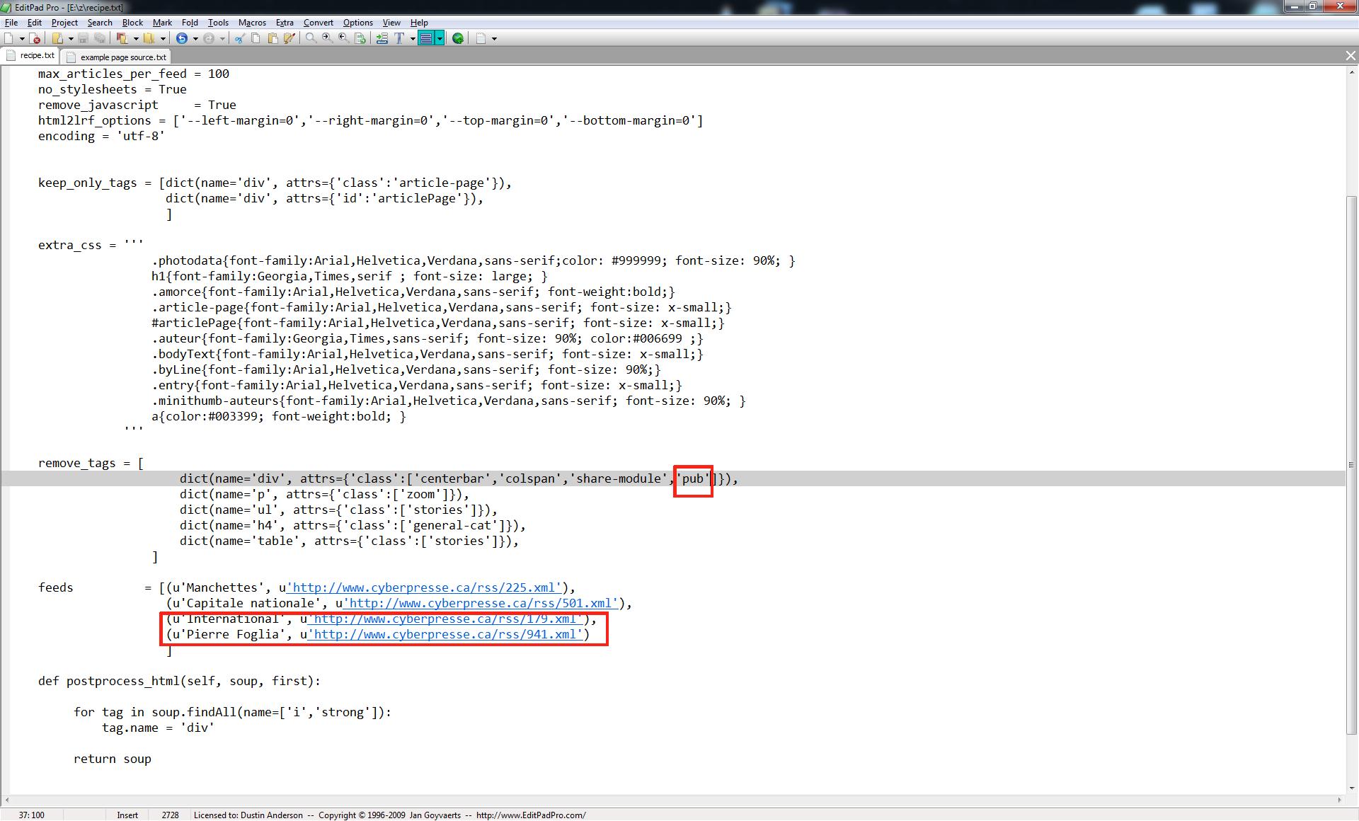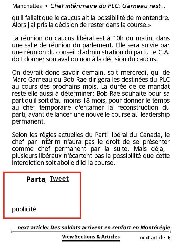 I have succeeded chosing my preferred feeds and in removing "publicité" by adding the class 'pub' to the 'div' removed_tags (modified recipe): But I don't know how to remove the "Parta"and "Tweet" (sample source html showing the end of an article): Your help would be much appeciated. |