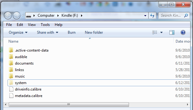 Or you can click in the address bar in the empty space next to Kindle (F: ) (or whatever your Kindle drive letter is) and it will turn into a path you can type in, just type "system" after the F:\. (It's the only hidden folder in there, so it's easy to remember.) That works in 7 & Vista.