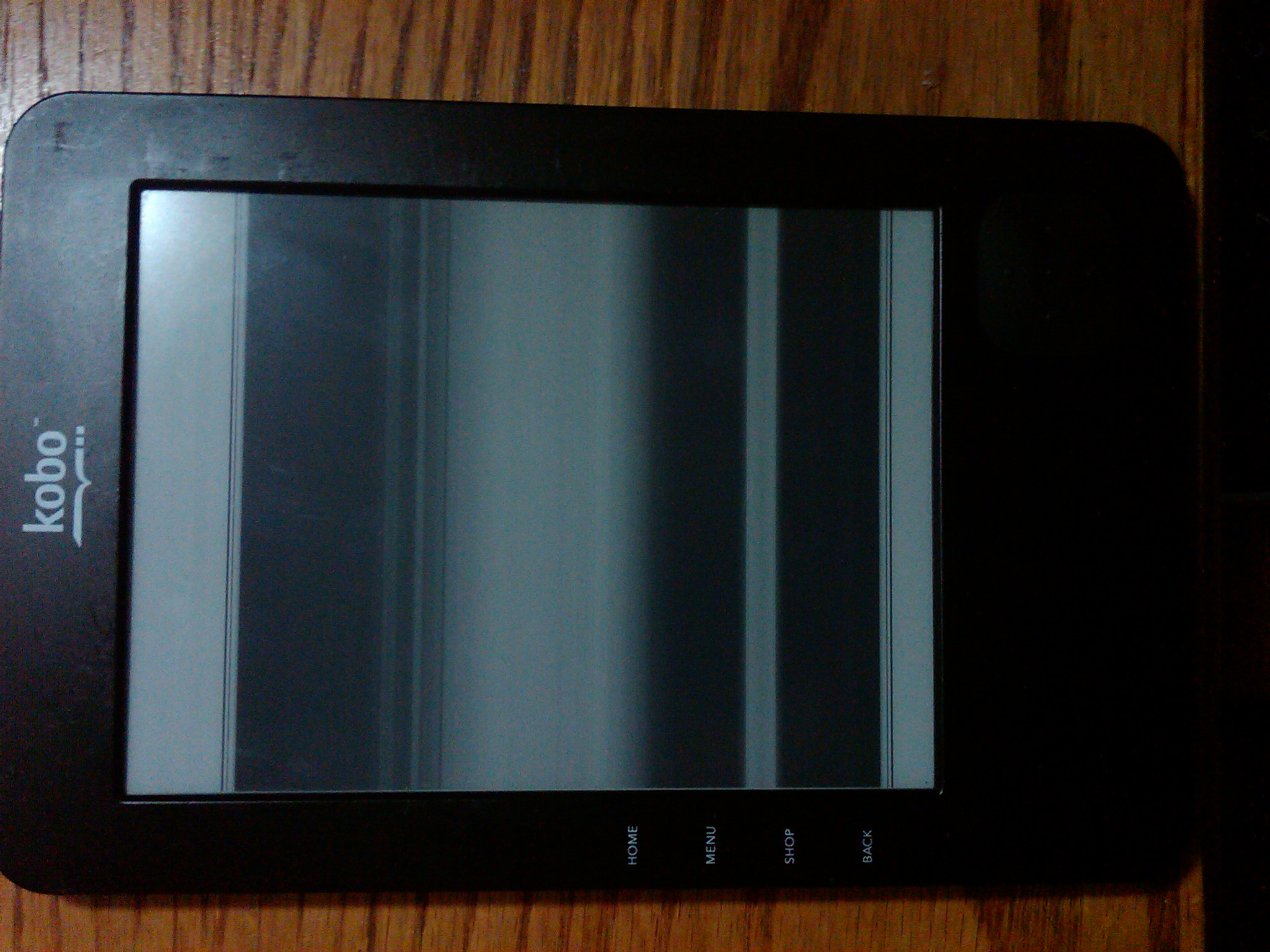 Last night, I sat my Kobo down for a minute and when I picked it up, the screen had no text, but faint lines running horizontally across. The software appears to be responding to button pushes, but the screen only displays more lines. Here are some pics: |