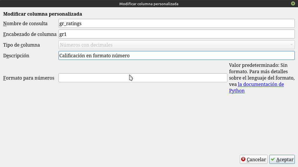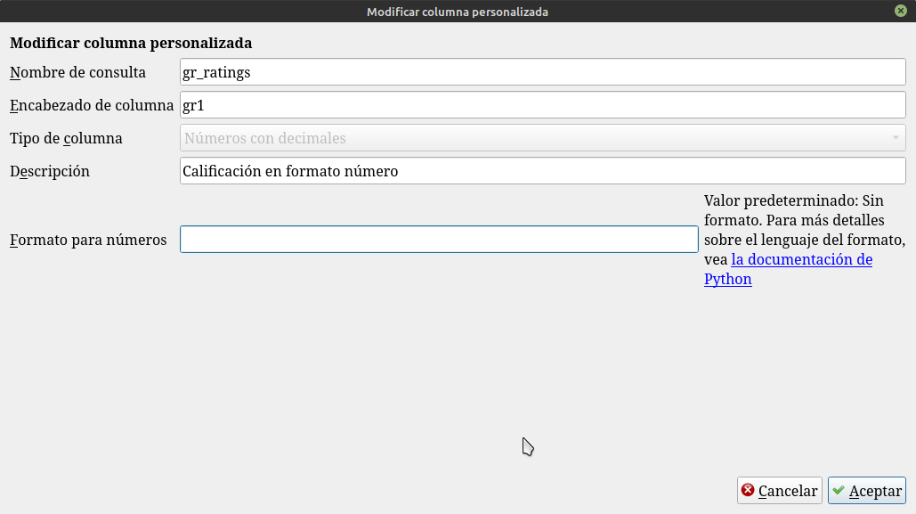 What is in the publisherfield after you used goodreads-rating? According to your screenshot you exchanged gr1 and gr_ratings for the column. gr1 must be in the upper field, en gr_ratings in the second field. Presuming the order of the field is the same, dispite of the language ( if that is good english;-) Last edited by Pr.BarnArt; 02-17-2020 at 03:11 PM. |