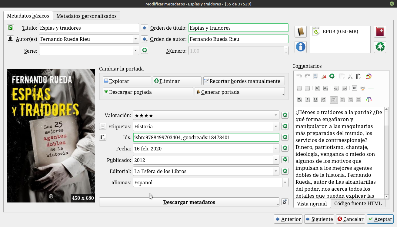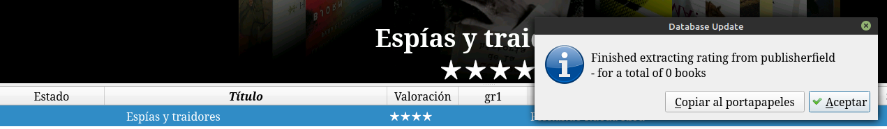 In the publisher field (editorial) the rating is missing. I got as result: La Esfera de los Libros#PrB.rating#3.73 Do you use goodreads_rating with the right version: 3.0.0 ? See the link in the first post of this topic. And did you disable other metadata-plugings ( p.e. goodreads ;-), just to prevent their results will be used. Last edited by Pr.BarnArt; 02-18-2020 at 05:23 PM. |