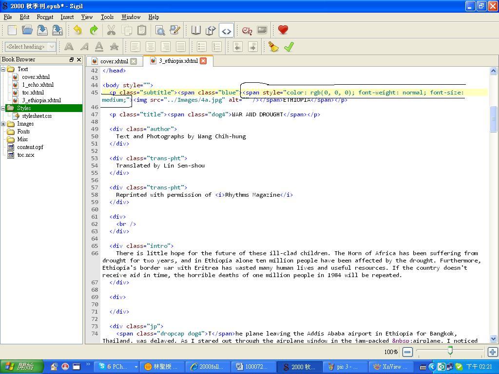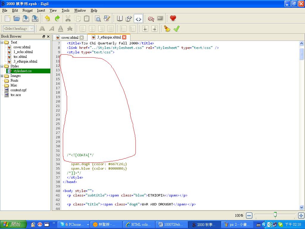 The first problem is illustrated in pic2 (please see the red circles I created). After I pasted the document into a new Sigil file, I went to the Source Code View and found the strange things I marked in the red circles. What are these, and are they needed? The second problem is illustrated in pic3. After I left and entered the Source Code View several times, I discovered that this area was getting bigger with nothing showing up! What's going on? The third problem is illustrated in pic4 and pic5. I discovered that each time I inserted a picture, something like what I circled in red would appear before the picture document. I then found out that it did was to "normalize" the properties of the picture file. So again, is something like this normal? |