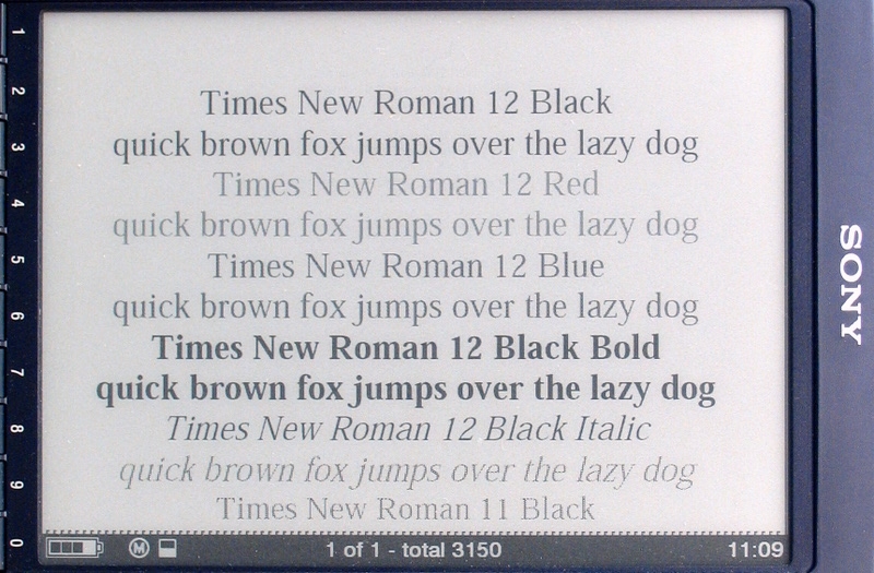 I attach a photo taken with Canon Powershot Pro 1 in dim daylight conditions (in the middle of the room with venetian blinds) at 100 ISO. The original is much more difficult to shoot than a black and white paperbook, because the Sony screen is greyish. The focus was set manually.