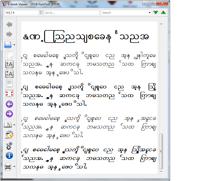 Recently, I saw a few articles on non English fonts and started embedding as well as installing fonts in the device. Some epub work well but some came out with wrong glyphs. Then I start some plug ins for fonts. I have really messed up calibre. Now English epubs are also coming out with Burmese fonts which really screws things up. I could run a convert of this file with extra css instructing to use and English font in the body section. Burmese epubs are not coming out correctly. I have tried to go back to the original version by reinstalling. It didn't work. I then deleted the program from control panel and deleting the folder and reinstalling a new download. Still I have the same problem. I would like kovid to help me asap. Thanx. I am running Win 7 and reading with sony 505 and nook color. Attached a screen shot. This is from ePub Font Test. |