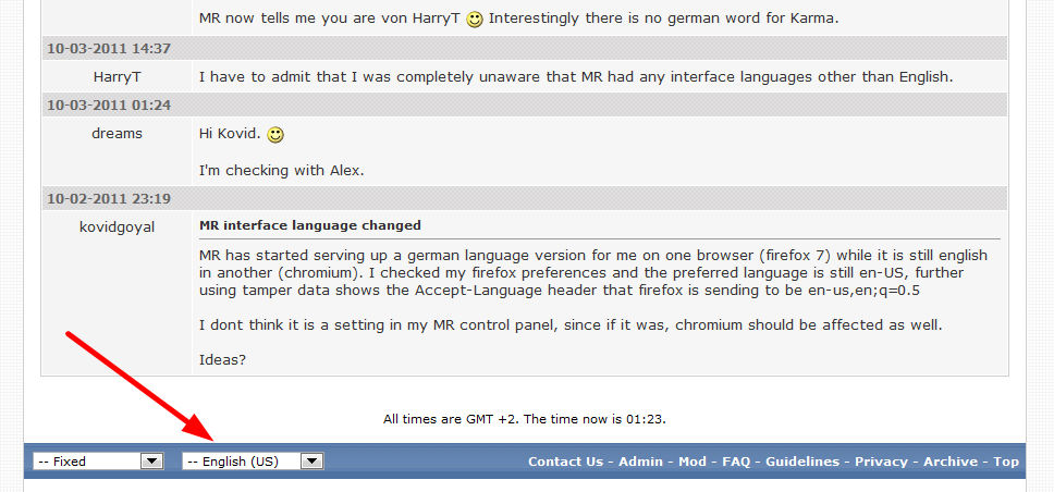 MR has started serving up a german language version for me on one browser (firefox 7) while it is still english in another (chromium). I checked my firefox preferences and the preferred language is still en-US, further using tamper data shows the Accept-Language header that firefox is sending to be en-us,en;q=0.5