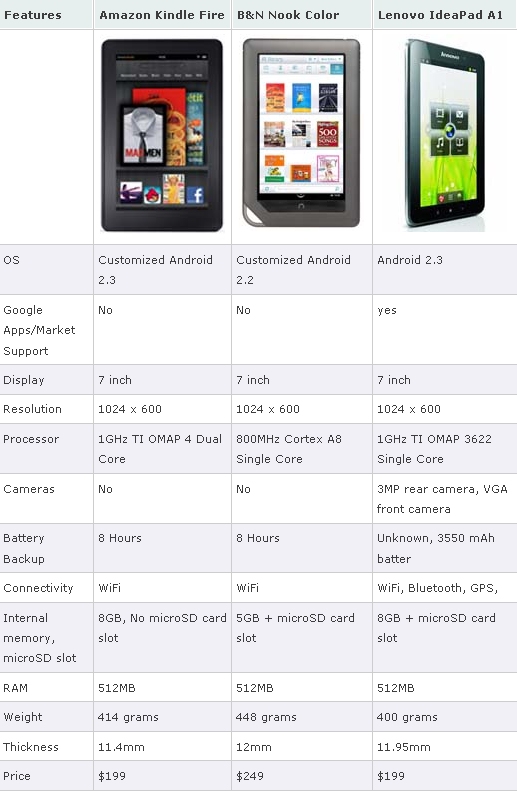 Chart -Amazon Fire, Current Nook Color, Lenovo A1