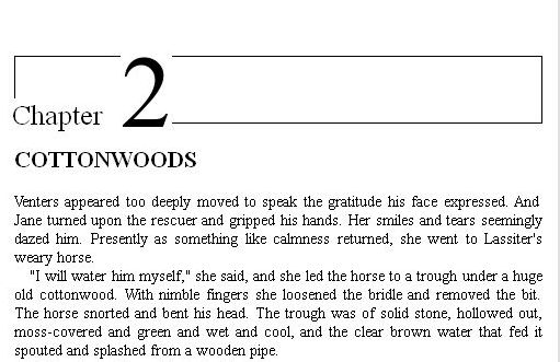 When I found this example of a free Zane Grey novel at feedbooks.com (I've read Zane Grey when I was a boy), I was charmed with the intricate formatting of the chapter headline. Until then I've thought only of <h2 align="center">Chapter 1</h2>. Do you have other examples of a more elaborate design of headlines or first paragraphs (i.e. p:first-letter) or a combination of both? Perhaps your own ones? George |