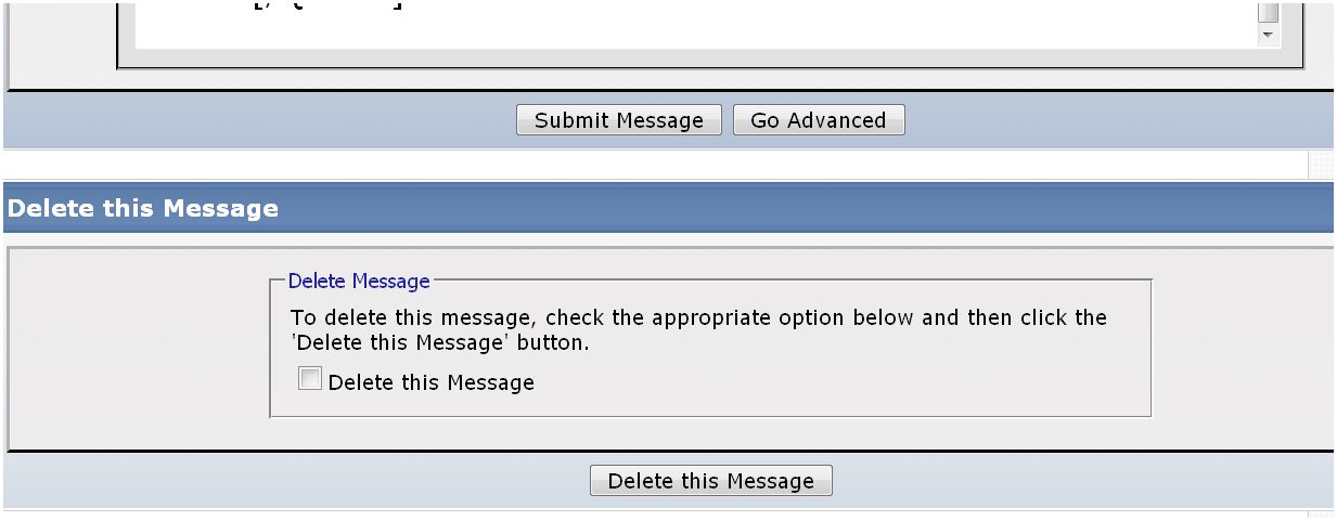 When you are in the PM, you can just scroll down to the bottom to click "Delete this Message". Or you can do more than one by clicking all the boxes next to the messages you want to delete and then scrolling all the way to the bottom and using the "Selected Messages" menu box. Just click the arrow and choose "Delete". |