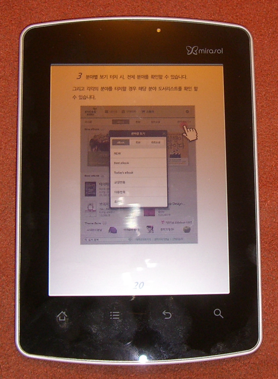 ![]() It's good that it has English too, not Korean only... ![]() New Mirasol tech: http://www.mirasoldisplays.com/ereader Display is VERY COOL! Nice colors, fast enough and very good readable without backlight (more accurately - it is a SIDElight), the battery lifetime must be longer than in eInk displays (stated in some sources as 20-400% less energy consumption) and a LOT longer than in plain Android LCDs... But it has a good backlight for night-reading too... Some sluggish reaction to touches - but I think it is a customized Android problem, or some sensor defects... It is a first device with Mirasol, some defects or glitches in the first devices are normal thing nowadays... ![]() I have not tried yet to install applications or a plain Android on it - but even in this state it is relatively well usable... Sorry my English... |