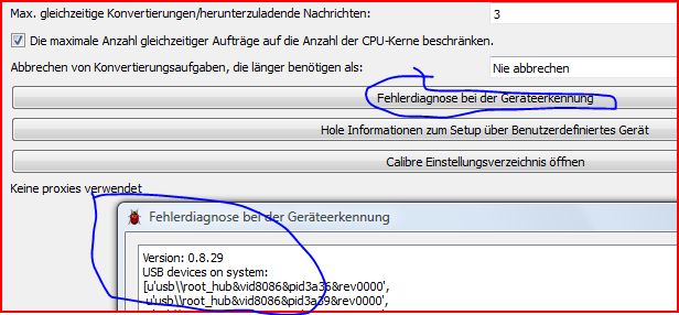 Version: 0.8.29 USB devices on system: [u'usb\\root_hub&vid1002&pid4389&rev0000', u'usb\\root_hub&vid1002&pid4388&rev0000', u'usb\\root_hub&vid1002&pid4387&rev0000', u'usb\\root_hub&vid1002&pid438b&rev0000', u'usb\\root_hub&vid1002&pid438a&rev0000', u'usb\\root_hub20&vid1002&pid4386&rev0000', u'usb\\vid_045e&pid_008c&rev_0057', u'usb\\vid_059b&pid_0475&rev_0100', u'usb\\vid_05e3&pid_0608&rev_0702', u'usb\\vid_05e3&pid_0608&rev_0702', u'usb\\vid_05e3&pid_070e&rev_9602', u'usb\\vid_1267&pid_0103&rev_0101', u'usb\\vid_1267&pid_0103&rev_0101&mi_00', u'usb\\vid_1267&pid_0103&rev_0101&mi_01', u'usb\\vid_152d&pid_2329&rev_0000', u'usb\\vid_1e68&pid_004e&rev_0002'] Drives detected: (0) E:\ ~ \\?\STORAGE#VOLUME#_??_USBSTOR#DISK&VEN_TREKSTOR&P ROD_EBOOK_PLAYER_7&REV_1.00#20080411190388106&0#{5 3F56307-B6BF-11D0-94F2-00A0C91EFB8B}#{53F5630D-B6BF-11D0-94F2-00A0C91EFB8B} Available plugins: ADAM ALEX ALURATEK_COLOR ANDROID ARCHOS7O AVANT AZBOOKA BAMBOOK BLACKBERRY BOEYE_BDX BOEYE_BEX BOOQ BOOX COBY COOL_ER CYBOOK DBOOK E52 E71X EB511 EB600 EBK52 ECLICTO EDGE EEEREADER ELONEX ESLICK EX124G FOLDER_DEVICE_FOR_CONFIG GEMEI GER2 HANLINV3 HANLINV5 ILIAD INVESBOOK IPAPYRUS IREXDR1000 IREXDR800 IRIVER_STORY ITALICA ITUNES JETBOOK JETBOOK_MINI KINDLE KINDLE2 KINDLE_DX KINDLE_FIRE KOBO LIBREAIR LUMIREAD MENTOR MIBUK MOOVYBOOK N516 N770 N810 NEWSMY NEXTBOOK NOOK NOOK_COLOR NUUT2 ODYSSEY ORIZON PALMPRE PDNOVEL PDNOVEL_KOBO PICO PLAYBOOK POCKETBOOK301 POCKETBOOK360 POCKETBOOK360P POCKETBOOK602 POCKETBOOK701 PRS505 PRST1 README S60 SHINEBOOK SNE SOVOS SPECTRA STASH SUNSTECH_EB700 SWEEX TECLAST_K3 THEBOOK TREKSTOR USER_DEFINED VELOCITYMICRO WEBOS WEXLER Looking for devices... Devices possibly connected: None Das zeigt er mir bei meinem Windows 7 an. ------------------------------------------------- Und das bei dem XP meines Vaters: Version: 0.8.29 USB devices on system: [u'usb\\root_hub&vid1002&pid4389&rev0000', u'usb\\root_hub&vid1002&pid438a&rev0000', u'usb\\root_hub&vid1002&pid438b&rev0000', u'usb\\root_hub&vid1002&pid4388&rev0000', u'usb\\root_hub&vid1002&pid4387&rev0000', u'usb\\root_hub20&vid1002&pid4386&rev0000', u'usb\\vid_03f0&pid_1405&rev_0100', u'usb\\vid_03f0&pid_c502&rev_0100', u'usb\\vid_03f0&pid_c502&rev_0100&mi_00', u'usb\\vid_03f0&pid_c502&rev_0100&mi_01', u'usb\\vid_03f0&pid_c502&rev_0100&mi_02', u'usb\\vid_04b4&pid_0033&rev_0100', u'usb\\vid_05e3&pid_0606&rev_0702', u'usb\\vid_05e3&pid_0720&rev_0033', u'usb\\vid_1e68&pid_004e&rev_0002'] Drives detected: (0) G:\ ~ USBSTOR\DISK&VEN_TREKSTOR&PROD_EBOOK_PLAYER_7&REV_ 1.00\20080411190388106&0 Available plugins: ADAM ALEX ALURATEK_COLOR ANDROID ARCHOS7O AVANT AZBOOKA BAMBOOK BLACKBERRY BOEYE_BDX BOEYE_BEX BOOQ BOOX COBY COOL_ER CYBOOK DBOOK E52 E71X EB511 EB600 EBK52 ECLICTO EDGE EEEREADER ELONEX ESLICK EX124G FOLDER_DEVICE_FOR_CONFIG GEMEI GER2 HANLINV3 HANLINV5 ILIAD INVESBOOK IPAPYRUS IREXDR1000 IREXDR800 IRIVER_STORY ITALICA ITUNES JETBOOK JETBOOK_MINI KINDLE KINDLE2 KINDLE_DX KINDLE_FIRE KOBO LIBREAIR LUMIREAD MENTOR MIBUK MOOVYBOOK N516 N770 N810 NEWSMY NEXTBOOK NOOK NOOK_COLOR NUUT2 ODYSSEY ORIZON PALMPRE PDNOVEL PDNOVEL_KOBO PICO PLAYBOOK POCKETBOOK301 POCKETBOOK360 POCKETBOOK360P POCKETBOOK602 POCKETBOOK701 PRS505 PRST1 README S60 SHINEBOOK SNE SOVOS SPECTRA STASH SUNSTECH_EB700 SWEEX TECLAST_K3 THEBOOK TREKSTOR USER_DEFINED VELOCITYMICRO WEBOS WEXLER Looking for devices... Devices possibly connected: None Last edited by Speedy1976; 12-06-2011 at 05:36 AM. |