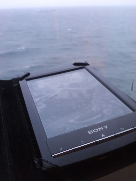 I guess every PRS-T1 owner has been wondering what Sony's engineers thought when they designed the E-reader in question with a glossy front bezel, the glare can be really annoying. Sure, there are cases that covers the bezel, but personally I rather attack the very root of the problem if I can ![]() Found the service manual here on Mobileread when googling for instructions on how to disassemble the PRS-T1, and with that at my disposal, opening the reader and removing the bezel was pretty easy. I made an opening tool as depicted in the service manual from a piece of ABS plastic. I wouldn't recommend metal, or anything else that's a lot harder than the material the shell is made of, it's probably made to be shock resistant, and that usually means its somewhat prone to plastic deformation. If you got a strong thumb nail, you could probably use that as well. Insert the tool between the back side and the bezel. I found it to be easiest to do in a corner, just bend out the bezel a little bit to make room for the tool, and insert it. Run the tool along the side, and bend the back side slightly outwards where the service manual says there's a claw. I did it in the order suggested in the service manual, I begun with the top, then did the sides, and finally the bottom. In any case, do the bottom last, it makes it a lot easier to get the shell loose from the different connectors. Once the back side is removed, you'll see the motherboard assembly. It's fastened to the front bezel with six small black Philips screws, three in the top and three in the bottom. Unscrew those and keep them somewhere where you won't loose them, they're pretty small. Next you need to loosen the wlan antenna. It's a little white tab, maybe 5x7 mm or something like that, with a black coax cable connecting it to the motherboard. It's glued to the front bezel. Peel it loose, be careful not to damage it. Never pull the cable in any way. Now you can start removing the front bezel, follow the instructions in the service manual. What the service manual don't tell you is that there's a strip of double-sided tape on each side of the screen, holding the bezel down to the motherboard assembly. Insert the tool between the bezel and the motherboard assembly, and turn it while lightly pulling the bezel away from the motherboard. Move it a bit further down, rinse and repeat. Don't use too much force, I don't think the bezel can withstand all that much abuse. Hopefully you've now managed to remove the bezel in one piece, and it's time to do something about the gloss. Personally I used 380 grit valve grinding paste and a rag, but I reckon you can get almost as good results using fine grit water sanding paper, or perhaps even a Scotch brite pad. Cover the button row and the brushed aluminum piece with the Sony logo on it with tape for protection, and then start working the bezel with whatever abrasive you got at hand ![]() Once done, clean the bezel thoroughly. And old toothbrush is very helpful when removing residues from the grinding lodged between the buttons. Personally I washed it with water and detergent. Put it all together in the reverse order you took it apart. Snap on the bezel, replace the screws, attach the wlan antenna where it used to be, and finally snap the back cover back on. Done! Here's how my PRS-T1 looks now. As I'm at sea for moment, I don't have my camera with me, so I had to snap the pic with my phone. I really hope the bad image quality is excused by the nice background view. You can even see a little dry bulk loader if you look closely