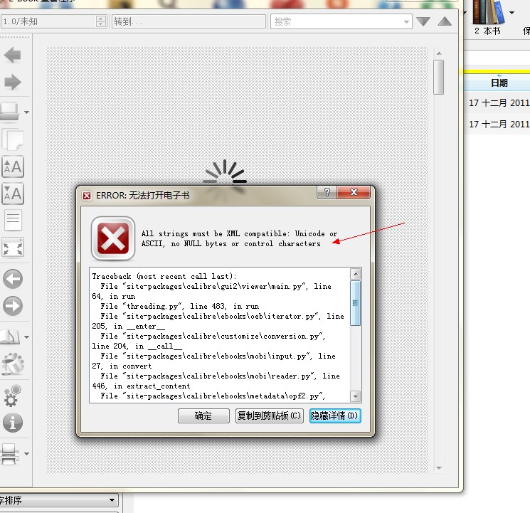 When I open the epub file, there are: calibre, version 0.8.31 ERROR: 无法打开电子书: E:\PDF书籍\Calibre书库\John Schember\Calibre Quick Start Guide (1)\Calibre Quick Start Guide - John Schember.epub is not a valid EPUB file Traceback (most recent call last): File "site-packages\calibre\gui2\viewer\main.py", line 64, in run File "threading.py", line 483, in run File "site-packages\calibre\ebooks\oeb\iterator.py", line 205, in __enter__ File "site-packages\calibre\customize\conversion.py", line 204, in __call__ File "site-packages\calibre\ebooks\epub\input.py", line 151, in convert ValueError: E:\PDF书籍\Calibre书库\John Schember\Calibre Quick Start Guide (1)\Calibre Quick Start Guide - John Schember.epub is not a valid EPUB file When I open the mobi file, there are: calibre, version 0.8.31 ERROR: 无法打开电子书: All strings must be XML compatible: Unicode or ASCII, no NULL bytes or control characters Traceback (most recent call last): File "site-packages\calibre\gui2\viewer\main.py", line 64, in run File "threading.py", line 483, in run File "site-packages\calibre\ebooks\oeb\iterator.py", line 205, in __enter__ File "site-packages\calibre\customize\conversion.py", line 204, in __call__ File "site-packages\calibre\ebooks\mobi\input.py", line 27, in convert File "site-packages\calibre\ebooks\mobi\reader.py", line 446, in extract_content File "site-packages\calibre\ebooks\metadata\opf2.py", line 1278, in render File "site-packages\lxml\builder.py", line 210, in __call__ File "site-packages\lxml\builder.py", line 195, in add_dict File "lxml.etree.pyx", line 2145, in lxml.etree._Attrib.__setitem__ (src/lxml/lxml.etree.c:46818) File "apihelpers.pxi", line 563, in lxml.etree._setAttributeValue (src/lxml/lxml.etree.c:15781) File "apihelpers.pxi", line 1366, in lxml.etree._utf8 (src/lxml/lxml.etree.c:22211) ValueError: All strings must be XML compatible: Unicode or ASCII, no NULL bytes or control characters PLZ HELP ME! I re-install the Calibre for many times, but I doesn't work :( |