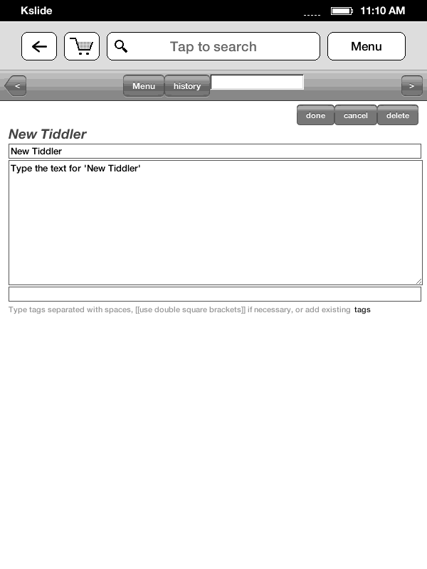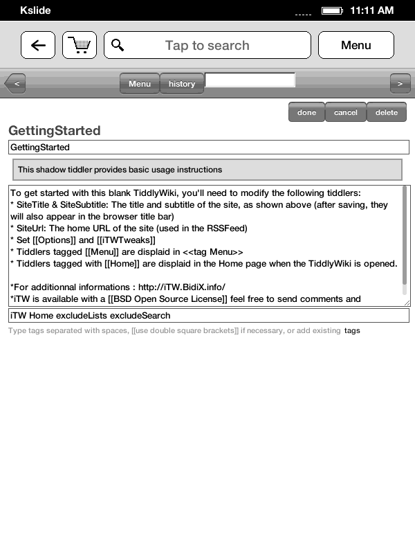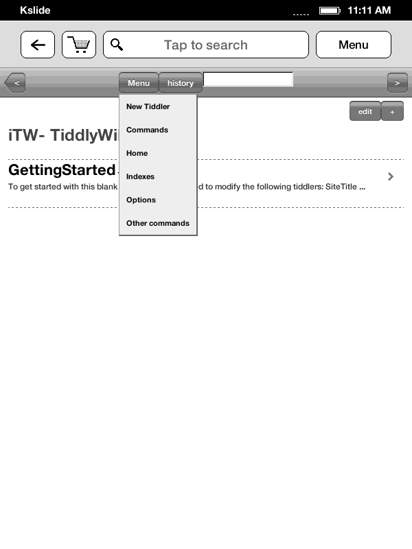 In other words it is a good offline notepad for browser. I tried some versions ( for example this one) on Touch replacing it with index.html of an extension with no success. There is no problem when I tried to open the page and edit. However I couldn't save my notes. Hence there are two problems for a tiddly-waf extension: 1- a good layout 2- the problem I mentioned above. Last edited by thomass; 03-15-2012 at 06:46 PM. |