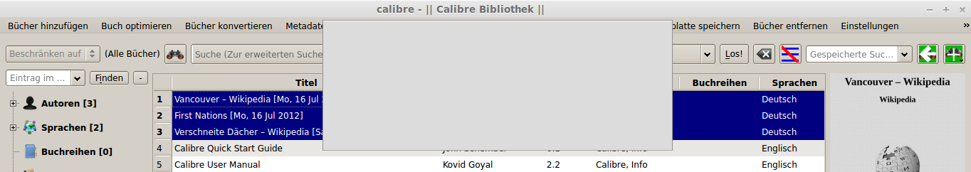 That unmovable grey field, shown in the attachment, appears after quite different actions, here after I changed the language of the first 3 books from English to German. To get rid of it I have to restart the laptop, to restart only calibre doesn't help. That is time consuming, why is that and what stops that, regards chaot |