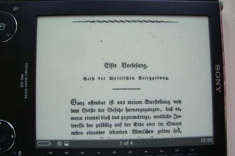 Second: I’m really interested in an e-ink-device. Considering price, weight, battery life, and file-formats, I’m thinking about the lbook (or bebook) or the CyBook. I prefer the latter because of the Mobi-Format (and, getting it in the UK or via justread, it’s cheaper). I'm from Germany, so perhaps the Sony PRS-505 or 700 is also an option (for the next future). But, of course, I have some questions about the devices It’s, of course, about the readability and getting stuff on it.I would like to read some classics from “Projekt Gutenberg” (the German version) or Zeno.org, and they are just plain text. So I think there should be no problems formatting them in a correct manner (I tried it via Mobipocket Reader and it was quite okay on the computer screen). But I would also like to read some really old things from Google's booksearch. These are scans and they are PDF. I knew about PDF and the problems on small e-ink-screens. But the books are not that big, about DIN A5, sometimes smaller. Sometimes up to 50 MB (but I can split them). With Acrobat Pro I could crop the white-space. I’ve done this for a file, I’ve attached (it's from Google). Is anyone here, who could load these file in his or hers Cybook (or Bebook or Sony Reader) and post a Screenshot? So I could decide for myself about the readability?