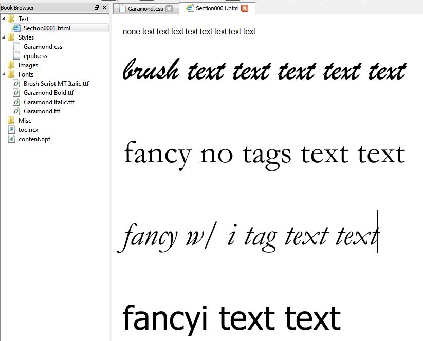 <?xml version="1.0" encoding="utf-8" standalone="no"?> <!DOCTYPE html PUBLIC "-//W3C//DTD XHTML 1.1//EN" "http://www.w3.org/TR/xhtml11/DTD/xhtml11.dtd"> <html xmlns="http://www.w3.org/1999/xhtml"> <head> <title></title> <link href="../Styles/Garamond.css" rel="stylesheet" type="text/css" /> <link href="../Styles/epub.css" rel="stylesheet" type="text/css" /> </head> <body> <p>none text text text text text text text text</p> <p class="brush">brush text text text text text</p> <p class="fancy">fancy no tags text text<br /></p> <p class="fancy"><i>fancy w/ i tag text text</i></p> <p class="fancyi">fancyi text text</p> </body> </html> and this CSS Code: