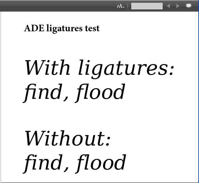 It should only use ligatures if they are defined in the font (and that is indeed what happens in my reader). So, either ADE 2.0 is broken or the font is broken (i.e. it defines a ligature that it doesn't really have). Is the font maybe a subset? In that case the subsetting software is probably breaking the font. I don't know if you can disable ligatures in ADE, probably not (I believe the Cybook Odyssey allows that, though). You could prevent ligatures by inserting zero-width-no-break spaces (whatever the code is) between the letters... but that's an UGLY hack for this use. |