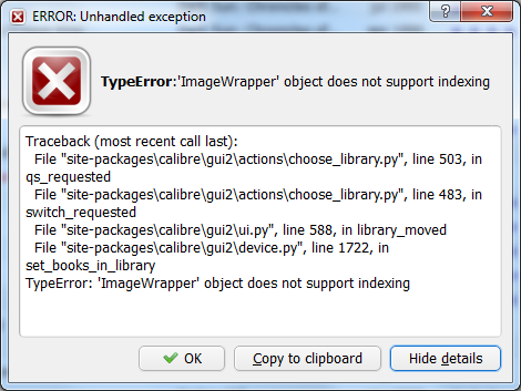 Just upgraded tot 0.9.16 (32-bits) and after sending some books to my e-reader (PRS-T1) I switched to another library. The following error did occur. All libraries checked out fine, though. No clue what caused this. No further problems noticed yet.