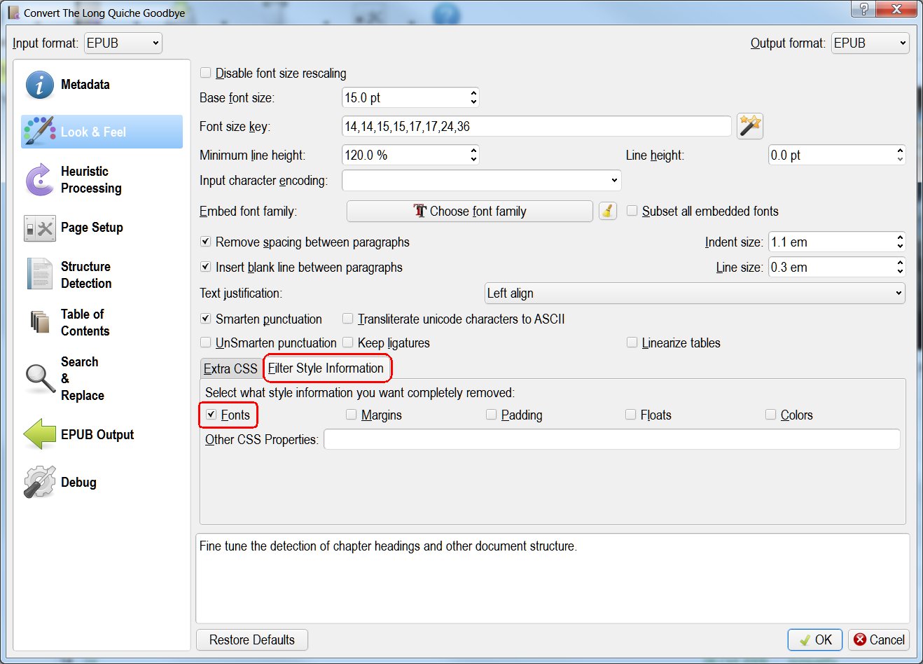 I removed the DRM using a method that is not relevant to this conversation and viewed the book in Calibre's internal reader. It shows the typeface as sans-serif (at least my Kindle ignored the "sans-serif" instruction), and smaller than usual and bold. What I would like to do is try to convert the book from MOBI to MOBI, re-formatting it with no typeface instructions at all. I figure this would make it show up the same way as "regular" books. Can't seem to figure out how to go about this, though. Any suggestions? |