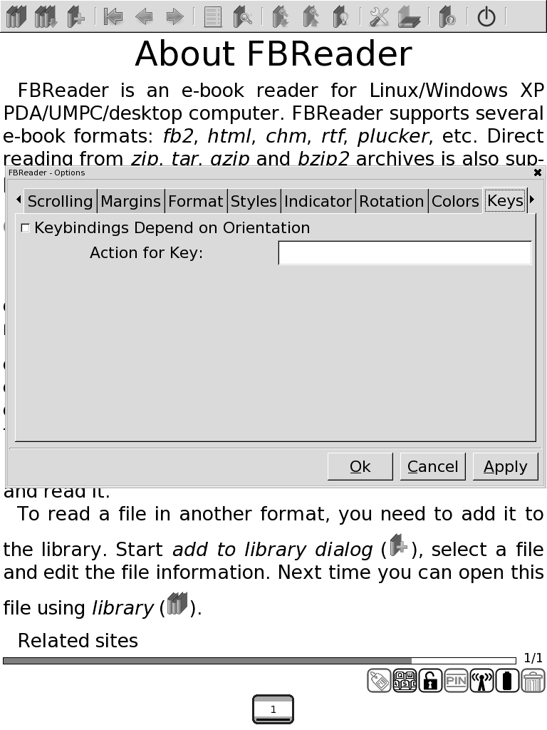Edit 2/12/08: The most recent port of FBReader can be found here: https://www.mobileread.com/forums/showthread.php?t=20490 I'm releasing 0.8.4 as an Ipkg package as defined here: https://www.mobileread.com/forums/showthread.php?t=10585 Let me know how the install goes. Everything should be very simple now that there is one version for all memory cards. One of the biggest changes is that the Options dialog now has arrows, so that all of fbreader's options can be changed. (see attached screenshot) Other changes since last iLiad release (0.8.2b) Quote: