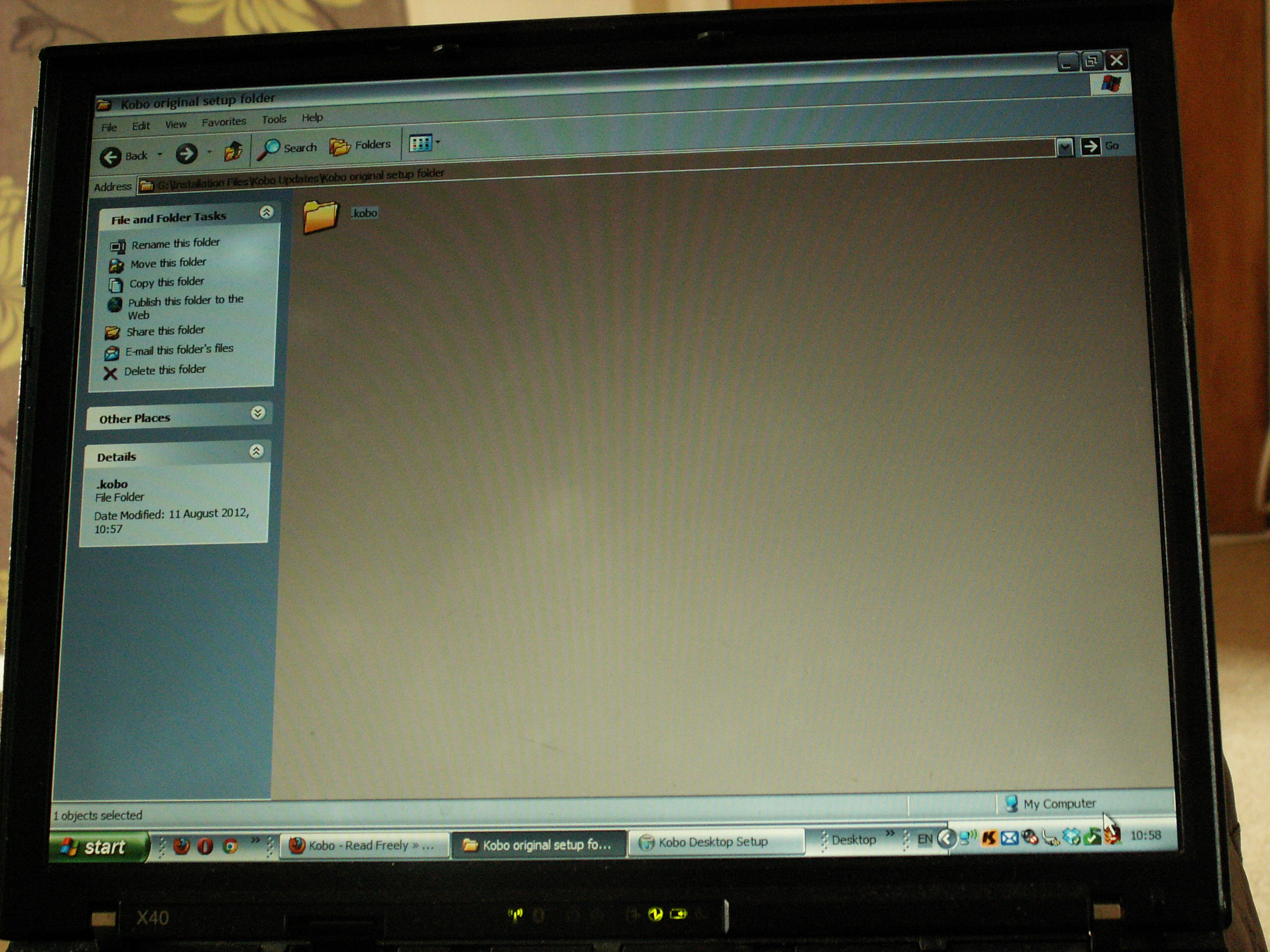 After setting the time (PICT4163.JPG), I had to decide what to do about setting up an account (PICT4164.JPG). I had read a great deal on https://www.mobileread.com/forums/sho...d.php?t=184373 that the latest firmware (2.0.0) is ... well, shall we say, 'buggy', and from that I'd decided that it might be as well to avoid setting up an account, from which I would end up with the latest firmware without any choice (a really poor system, Kobo - give people the choice). I had prepared for this by reading https://www.mobileread.com/forums/sho....php?p=1828566, which gives instructions for creating an account without needing Kobo, Desktop, downloading a program called SQLite Expert (http://www.sqliteexpert.com/download.html) to do it, and downloading various firmware versions by following the links on https://www.mobileread.com/forums/sho...d.php?t=185660. However, I decided to see if there would be any problems from following the recommended upgrade route on a brand new reader, since I have a theory that that many of the problems are associated with the database being occupied (i.e. having books already on). So, I connected the reader to my laptop (by the way, I don't like where the socket is - it will be a nuisance if I want to read whilst it is charging), and, reassuringly, saw the screen change to what I expected (PICT4165.JPG, phone in picture for no real reason!). To be on the safe side, once it was connected, I went into the KT from Windows Explorer, and found the main setup folder for the reader and copied it to a folder on my machine (PICT4166-7.JPG) just in case I wanted to go back. I know that this is what a factory reset should do, but it doesn't hurt to do backups anyway! [Split] Last edited by Peakcrew; 08-12-2012 at 01:27 PM. Reason: Corrections |
