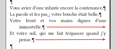 I discovered not long ago the negative indent, so you can see that my life is full of hope. ![]() I am looking on how to code this verse (screenshot) so that the last word(s) of a loong verse which have to go on a second line (with negative indent here) could be pushed to the right (see red arrows). I think it would make them more readable. The problem of course is that the paragraph is not right aligned while this (or these) words would probably have to be right aligned and that a bigger negative indent could give weird results with differents formats. Last edited by roger64; 02-09-2014 at 11:45 PM. |
