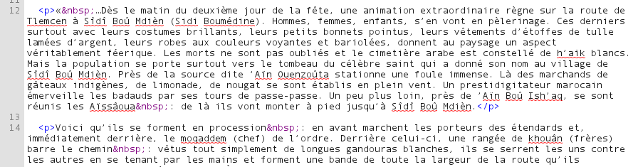 Désolé de squatter ton post, car mon message s'adresse à roger64. Mais je vais lire ton dernier epub ASAP! @roger J'ai déjà évoqué ce problème avec neufsix ici (https://www.mobileread.com/forums/sho...d.php?t=210252) post # 7, le 10 avril dernier. Tu es même venu lui dire un petit bonjour (post #6) et j'ai signalé ce lien dans ta requête auprès de meme. Dois-je en conclure que tu ne lis pas les messages lorsque tu participes à un fil? ![]() Dans le post # 7 j'ai noté que même s'ils sont indétectables à l'oeil nu, les espaces insécables de neufsix, et les tiens au demeurant, sont "actifs": tu n'as qu'à faire un test avec ta Kobo (ou ta Sony si elle est encore alive). Ou encore, "dézippe" le fichier epub et ouvre un fichier avec AOO. Il ne faut pas le sauvegarder par le bias de Sigil, car là et c'est vrai, on perd les insécables. Tu devrais les voir. Donc Sigil ne "tue pas en série" les espaces insécables " ", mais les rend indétectables. Pourquoi? meme nous le diras sans doute bientôt. Et, en passant, on ne retrouve pas du tout ce problème avec AWP: les espaces insécables sous la forme connue " " y sont présents et bien "visibles". C'est d'ailleurs pourquoi j'ai été étonné que tu soulèves ce problème. De plus, dans ma configuration de w2xhtml, la fonction "Use named character entities" a toujours été activée, donc pour moi les insécables étaient bien présents avec cette extension. Last edited by Arios; 05-25-2013 at 02:13 PM. |