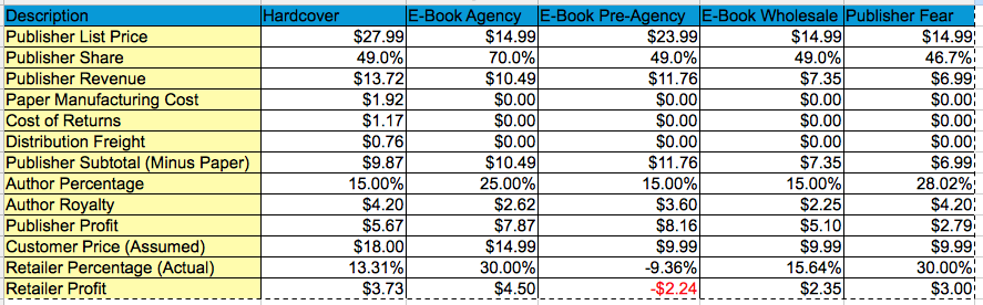 http://aardvarknow.us/2013/06/04/e-b...always-denied/ The slide shows that publisher profitability is up with agency, author royalties are down and customer prices are up. Something we already knew but I found it interesting to see a publisher admit it with numbers. I threw the numbers into a spreadsheet to expand the comparison in case anyone else is interested.