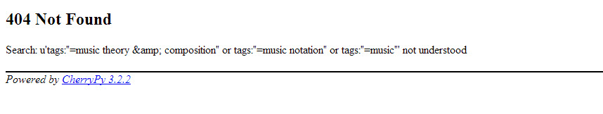 The single quotes are being added in the 404 page error message, they were never part of my saved search, if that helps. 404 Not Found Search: u'tags:"=music theory & composition" or tags:"=music notation" or tags:"=music"' not understood What should I do? |