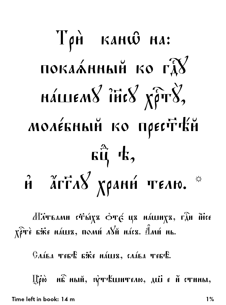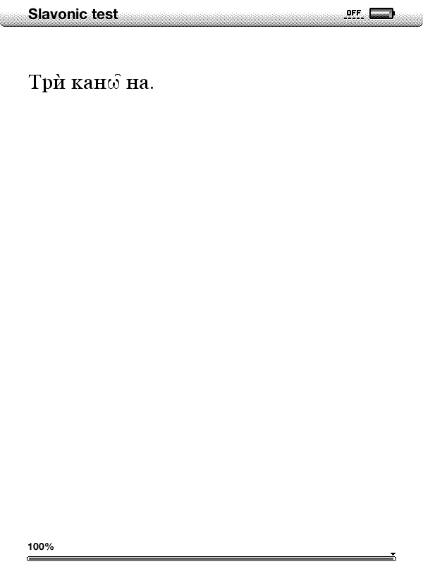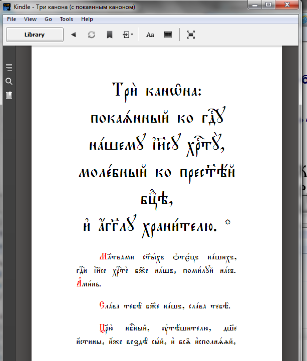 I tried Kindle viewer and it looks fine - attached. I've also attached a text version of input RTF. If you apply correct font, it looks fine on all viewers. The problem as you've pointed is encoding. This is old Slavonic text; there are plenty of websites and they all only displayed correctly if you have the right fonts installed. They are compartible with each other. Easiest format to read is PDF with embedded fonts; it always looks right on all devices. I'm really keen to use native Kindle format instead of PDF... Some encoding symbols can be seen here, I have not find a better explanantion of this encoding. http://www.fonts2u.com/orthodoxtt-ucs8.font Thanks a lot for your help. |