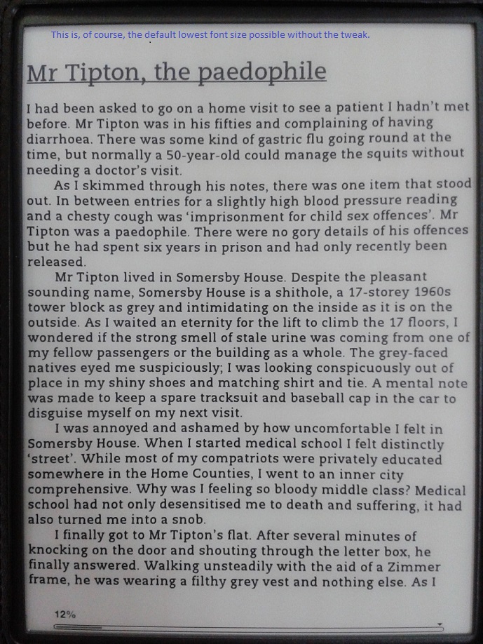 Hi, I've been away from the forum for a long time, so pardon me if this is common knowledge already. I installed the 3.4 update on my kindle keyboard just a month ago (I know, I've been living under a rock), and recently found a way to do achieve something I've wanted to do ever since I first bought my kindle - to reduce the font size so that it more closely matched the appearance of a pulp fiction paperback.