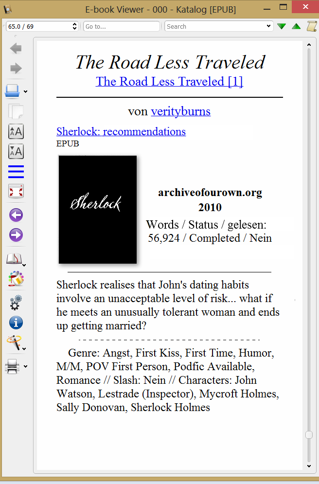 I'm confused too! You have to select AZW3, MOBI or EPUB for the catalogs format then you will get a one single e-book document. Isn't that what you wanted? ![]() You can even select more information for your catalog. Like for example me, reading a lot of fanfiction and wanting more information in it like genre, characters, In-Progress or Completed and other stuff. So I made me two custom columns (build from other columns) for the 'Other options' section in the catalog. One displaying: Words / Status / gelesen (meaning read) for the 'Extra Description note' Second displaying: Genre // Slash // Characters for the 'Merge with Comments' And I even included my column 'Community' in it under 'Included sections' so that I can also see all books of a community together as a section and scroll through the recommendations. You can see the outcome on the picture I attached. I found the catalog a perfect way to go through my library and select a new story when I'm not infront of my laptop. MiniMouse |