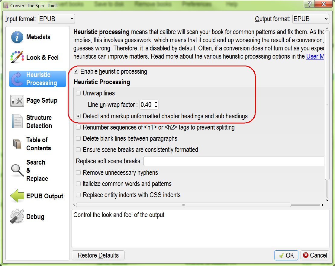 When I have a book that has labeled chapters such as Chapter 1, Chapter 2 etc.. or the chapters just labeled 1, 2, 3 etc... During the conversion process I enable Heuristic processing to mark up the chapter headings (see attached) and I force the use auto-genterated TOC (see attached). Often this will work flawlessly. If this doesn't provide the results your looking for sometimes the Eidt TOC feature can clean it up, but most likely I would go to Sigil at this point and manually markup the chapters. |