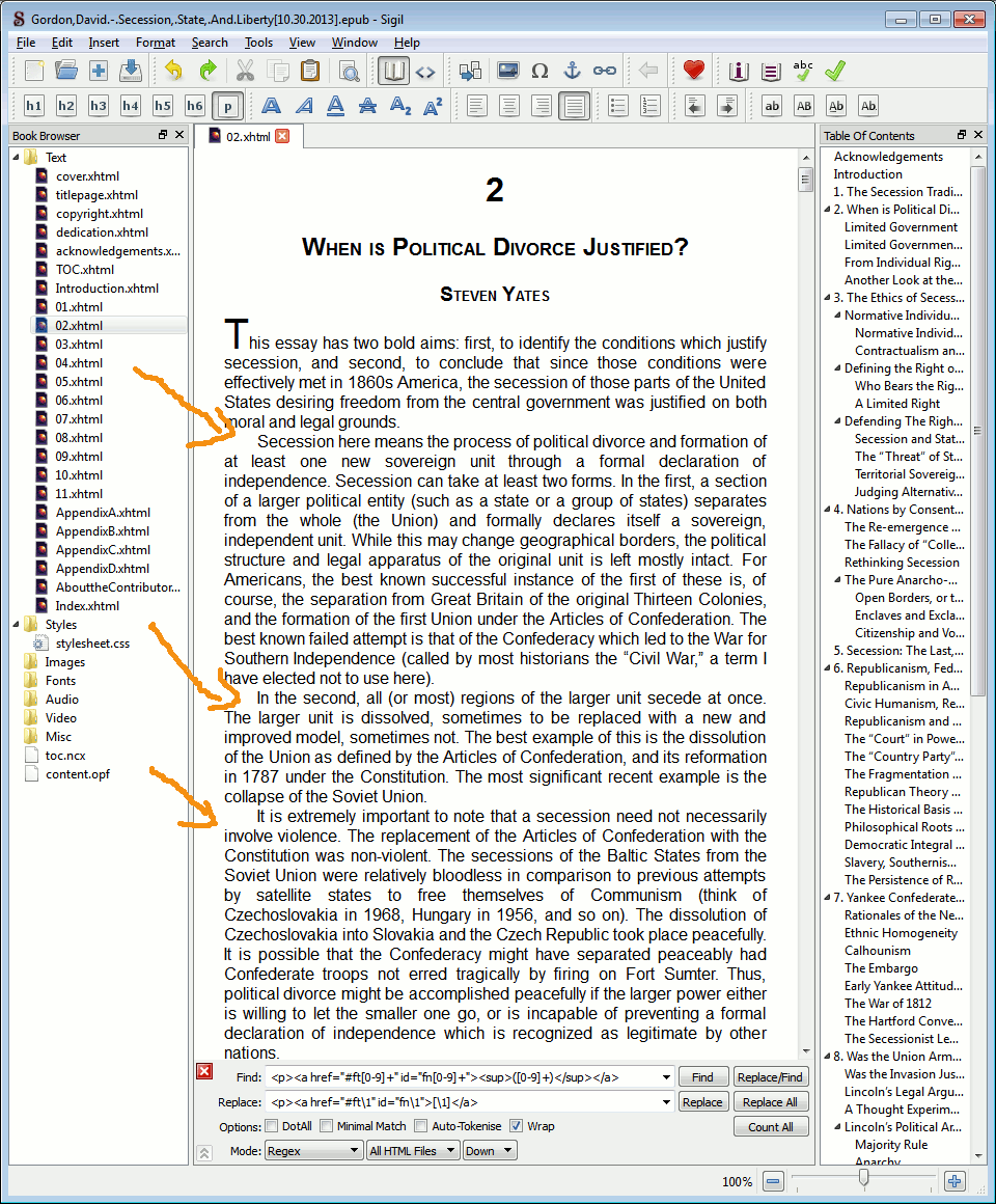 <link href="../Styles/stylesheet.css" rel="stylesheet" type="text/css" /> Side Note: If you DO NOT see a CSS file in your Styles folder. That means you will have to create one. Side Note #2: If you see a CSS file in your "Styles" folder, but DO NOT see the <link href [...]> at the top of your code, you can easily do this by following the instructions here for "Link Stylesheet": http://web.sigil.googlecode.com/git/...xt/styles.html If you open that the CSS stylesheet, you should hopefully see some generic code. What you are looking for is the section which assigns styles to "p" tags: It is this area where you want to add "text-indent: #.#em;", where "#.#" is the amount of spacing you want, and "em" is the unit of spacing ("1em" is approximately the width of one 'M' character). Usually, it is recommended to use anywhere between 1 to 2 em (I prefer 2em, JSWolf prefers 1.2em, others prefer smaller/larger). For example, this is what happens when you change the text-indent to 6em: If you need any more help, feel free to ask. ![]() Quote: