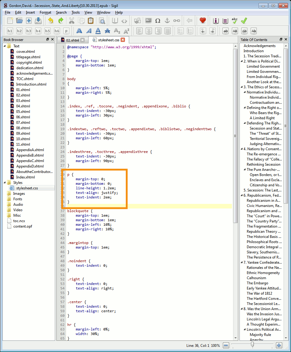 All the online posts I've read assumed knowledge I lack, so they weren't helpful at all. If this entry indeed belongs in my stylesheet, where exactly does it go, and how? As a longtime linux user, the procedure for solving issues like this was always to post the file in question so there was no doubt about where the new entry belonged. Before I go down that path, this is the stylesheet generated by sigil, not one of my own creation... Thanks. |