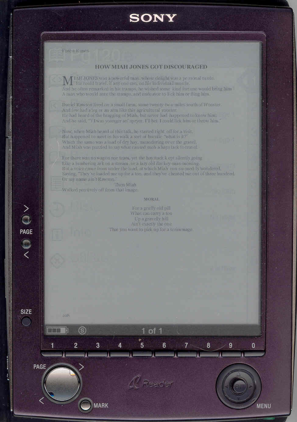 As a test, here is a single page from Forest Runes that has had the margins cropped off. I would like to see if someone with a Sony reader and a digital camera would post a picture, to see if this is readable without zooming. I picked this particular page because it has the poem with the longest lines.
