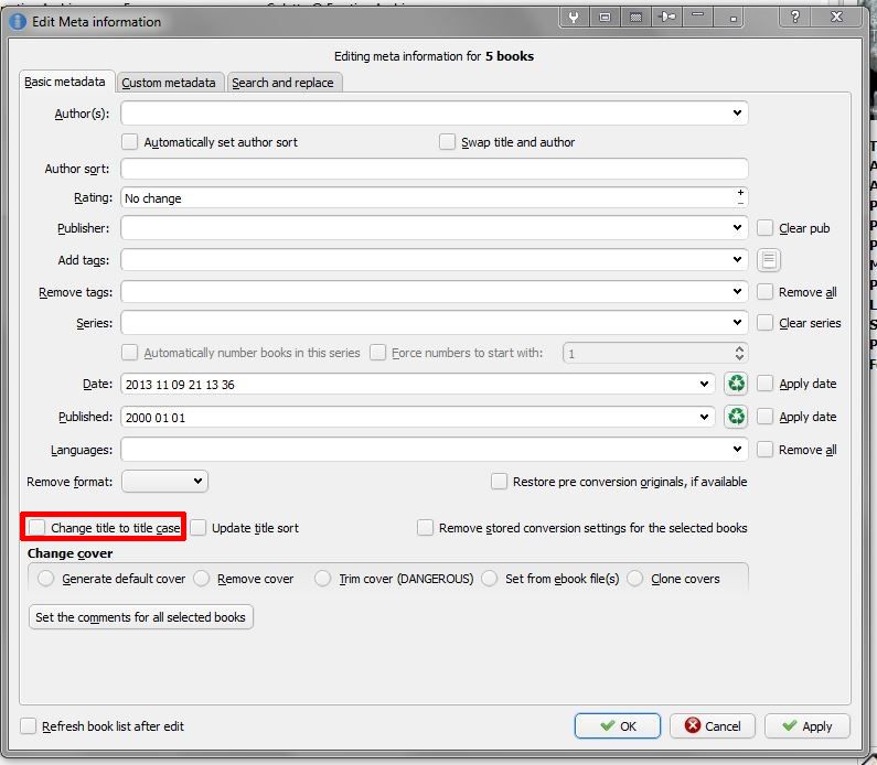 Again for future reference - you can change the 'case' of the title for an individual book via the context (right click) menu of the Title field in the single book version of Edit Metadata to one of the following UPPER CASE, lower case, sWAP cASE, Title Case Capital case (Capitalise) Bulk Metadata Edit only offers Title Case, which you could argue demonstrates a bias towards the Anglosphere - but that's true of most internetty stuff. It's something others are expected to tolerate, along with various Anglospherical misdeeds ![]() BR |