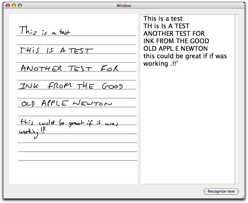 The only problem is that you are supposed to tell the engine when phrases are complete, and that seems to impact quite a bit the recognition. So far I just have a very crude way of segmenting the strokes in phrases, which kinda work but it shouldn't be difficult to come up with a vertical frequency method to classify the strokes, and that should be more robust. |