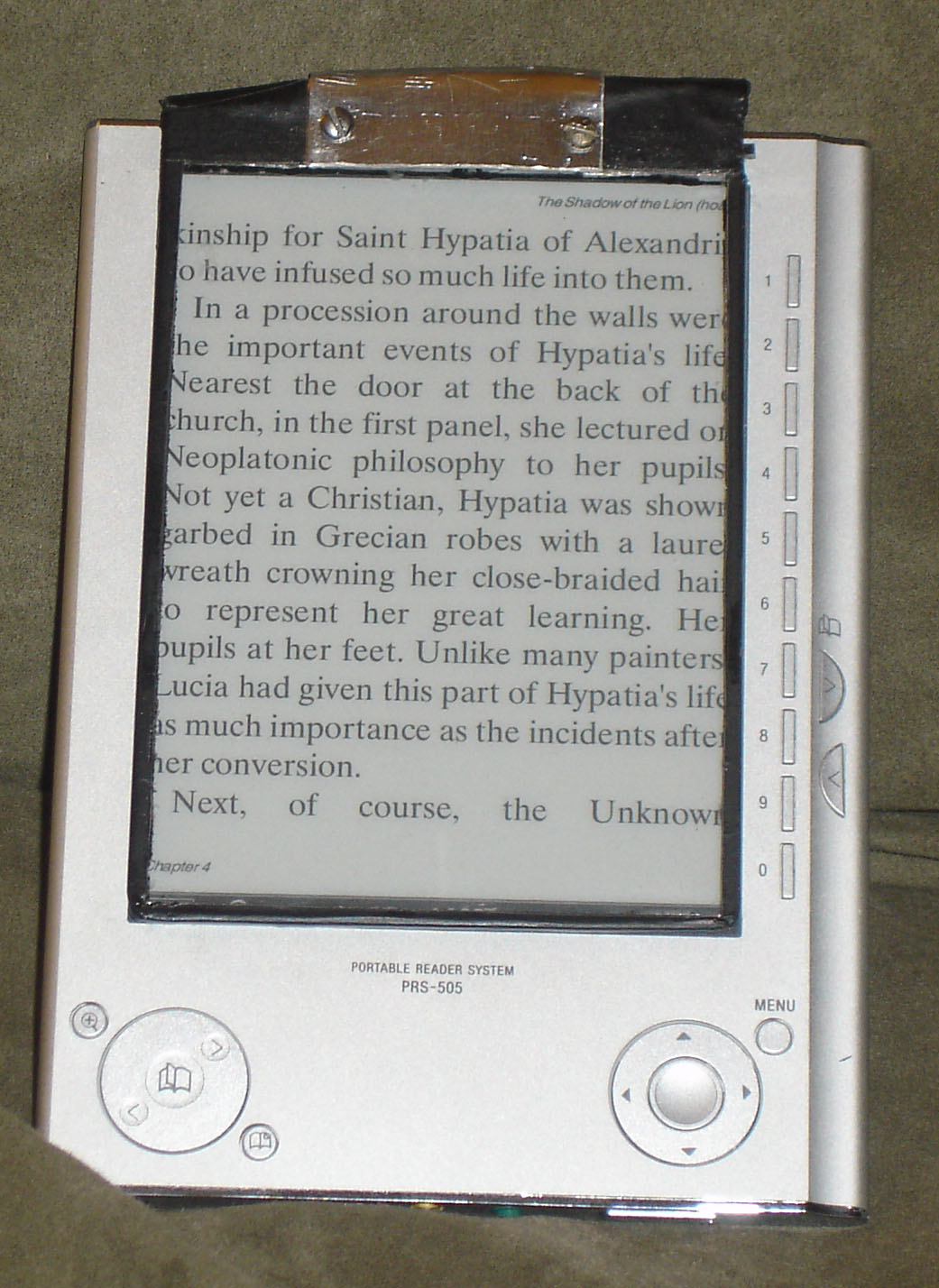 This book light was manufactured from a full sized light wedge. It has been milled down to fit perfectly (less than 0.5mm gap) within the recess of the sony readers screen. It is powered by two 3v button cells (pretty sure they are cr2012). It has limited battery life, and if my measurements are correct the light drains 8mA... so from a standard pair of cr2012s it should last between 6-10 hours. It is possible to find rechargeable cr2012 form factor batteries, but I felt it was prohibitive for a wide spread design. The Device is operated by a single sliding switch, in the upper right corner. The edges are covered with reflective foil tape, and painted black. This occludes about 2mm on each side, and the bottom. However I have not found it to be a significant problem, unless the word A or I have been at an edge. I will leave this post here for a few days to see if I get a strong enough response, if not I will put it up on ebay. As stated above, I am selling this to raise the money to refine the concept further, preferably to either sell a small batch of here, or sell to a 3rd party vendor for larger scale production. My "reserve" would be 50$us, as that is the money I have spend thus far on this, and will accept any offer of 100$us so long as I do not receive a higher offer within 12 hours. If someone purchases this for more than 100$us, they will also have first rights on my next prototype, as well as the right to purchase at a discount from any small batch production that I may make. I have been open about the limitations of this light, and any flaws, to the best of my knowledge. This is based on it being my creation, and having used it for approximately 2-3 hours of reading in a dark room (bed room at night) This is a prototype, buyer beware! What I am actually "selling" is an investment in further development of a similar product. V2Light.zip is a short vid of the light being turned on in a dark room, and the 505 going from a page of text back to the TOC Last edited by aapezzuto; 03-26-2008 at 08:30 PM. |