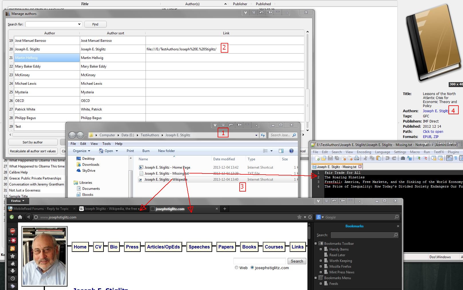 - and if you click the little down glyph at the end of the search bar, you'll see the previous dozen or more searchesI also find Quickview helps me keep track of what I'm doing - its very powerful, but since I came to grips with it - via some private discussion with chaley - I use it a lot. There is an existing feature via which I keep author notes, missing book lists, obits, press clippings, wikip and publisher links etc. But its not One-Click to set up, but once done it's One-Click to open up - see attachment 1. I created a folder in which I can keep author notes - in the attachment it's called E:\TestAuthors, This folder is quite separate and distinct from my Calibre library folders, and in it I created a folder for Joseph E. Stiglitz - that happens to the Author name exactly as I have it in calibre, but that is not essential - it could have been Joe Stiggy. 2. This can be the 'tricky bit'. You need to put a reference to the folder into the Author Link field in the Manage Authors list. I've only used this on Windows and I've found that it only works reliably if I use an 'internet style' link - i.e. file:///E:/TestAuthors/Joseph%20E.%20Stiglitz/, which is not the sort of thing that drips of the end of my fingers, so I use a shell extension called FileMenuTools (FMT) to get them. It would be nice if the Author Link field had a Browse button, like the Insert Link in Comments, but I use FMT a lot so I've never bothered Kovid to do an Enhancement. 3. Once you've done that you can put stuff into the folder - in the attachment I've put a couple of URLs and a text file into Stiglitz's folder. 4. When I click on Joseph E. Stiglitz link in Book details rather than opening the default link specified in Look & Feel->Book Details in a browser, my Test Authors\Joseph E. Stiglitz folder opens and from there I can do whatever I want. I stress this Author folder is NOT the Calibre library author folder - its in a parallel universe - and if I move or rename the folder I'll have to renew the link in Manage Authors. BR PS : I don't think there is anything in the manual about the Author Link Field Last edited by BetterRed; 12-04-2013 at 12:18 AM. Reason: clarity & ps: |