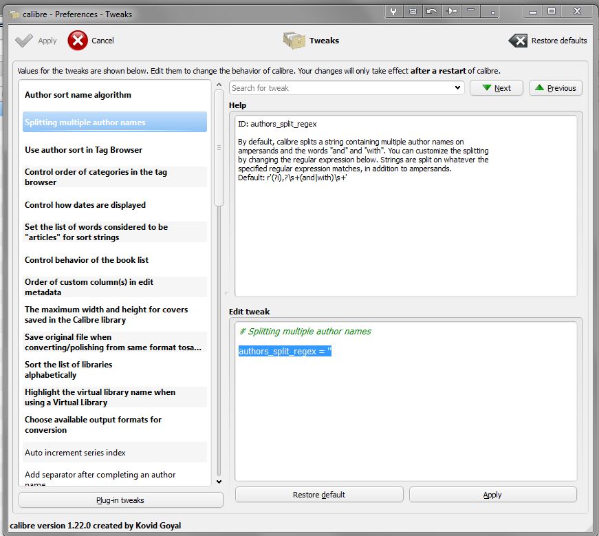 But, as theducks has the reminded us, doing this sort of thing can screw up your other libraries. I think all the Tweaks are global, so you have to remember to adjust them when you switch libraries. Maybe I should bite the bullet and put my 3 major libraries into separate calibre portable installation folders - weekend job I think BR Last edited by BetterRed; 02-05-2014 at 08:13 PM. Reason: add attachment |