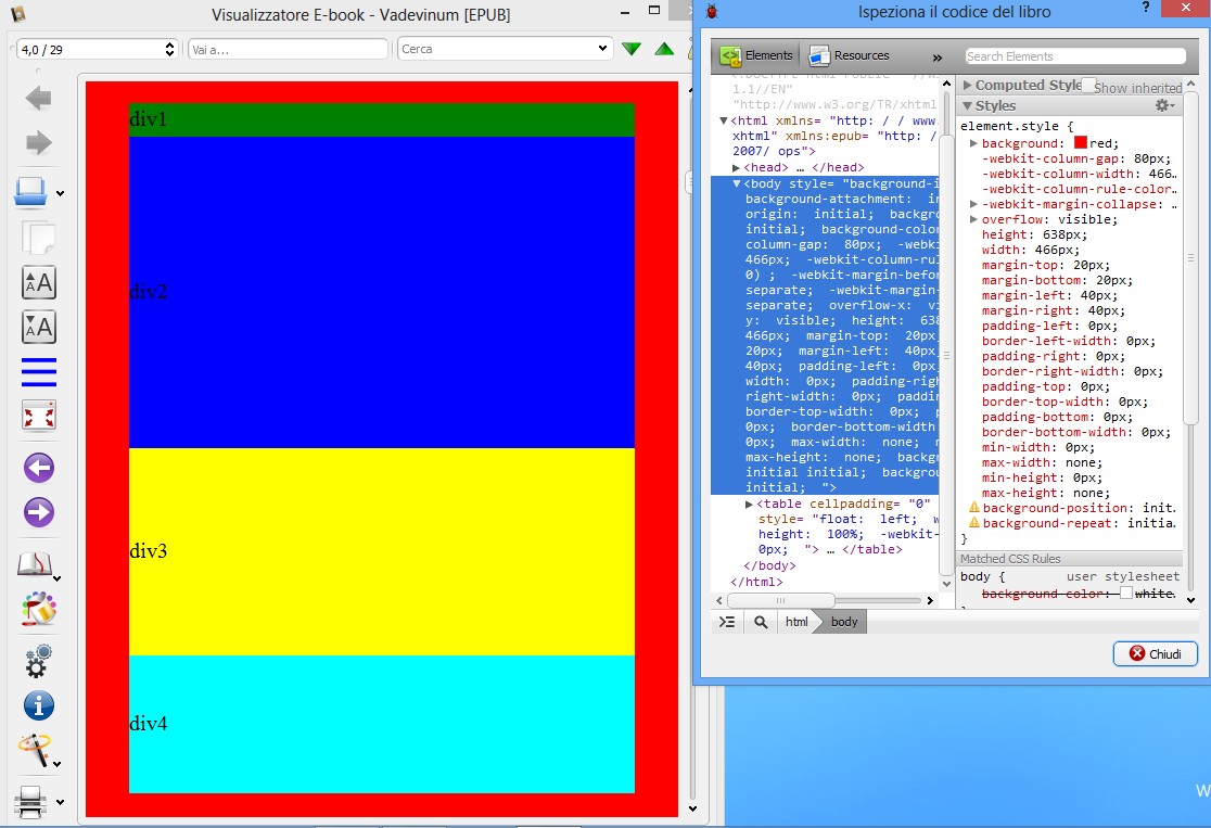 I try to post an other code: <?xml version="1.0" encoding="utf-8" standalone="no"?> <!DOCTYPE html PUBLIC "-//W3C//DTD XHTML 1.1//EN" "http://www.w3.org/TR/xhtml11/DTD/xhtml11.dtd"> <html xmlns="http://www.w3.org/1999/xhtml" xmlns:epub="http://www.idpf.org/2007/ops"> <head> <title>Page 3</title> </head> <body style="background: red; margin: 0;"> <table cellpadding="0" cellspacing="0" style="float: left; width: 100%; height:100%;"> <tr> <td style="background: green; height: 5%; width: 100%;">div1</td> </tr> <tr> <td style=" background: blue; width: 100%; height: 45%;">div2</td> </tr> <tr> <td style=" width: 100%; background: yellow; height: 30%;">div3</td> </tr> <tr> <td style="height: 20%; width: 100%; background: aqua;">div4</td> </tr> </table> </body> </html> In the attachment we see how Calibre shows it. But iBooks doesn't fit this page to the right dimension, i only have 4 short colored stripes. It should be a normal HTML behaviour but I think I'm missing something.. |