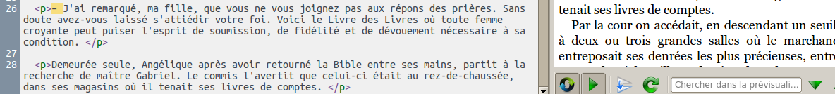 <span face="Georgia">(.*?)</span> \1 To get rid of them, I just added a new regex which destroyed all of them, including the ones left in the text files, and then launched "Beautify all files" (Embellit tous les fichiers) which reinstates them only in the right places. (screenshot2 - normal code display) Maybe when performing a regex suppressing tags in the text files, it would be nice if the Calibre editor could check if there are still some unwanted separators left? Last edited by roger64; 04-26-2014 at 04:48 AM. |