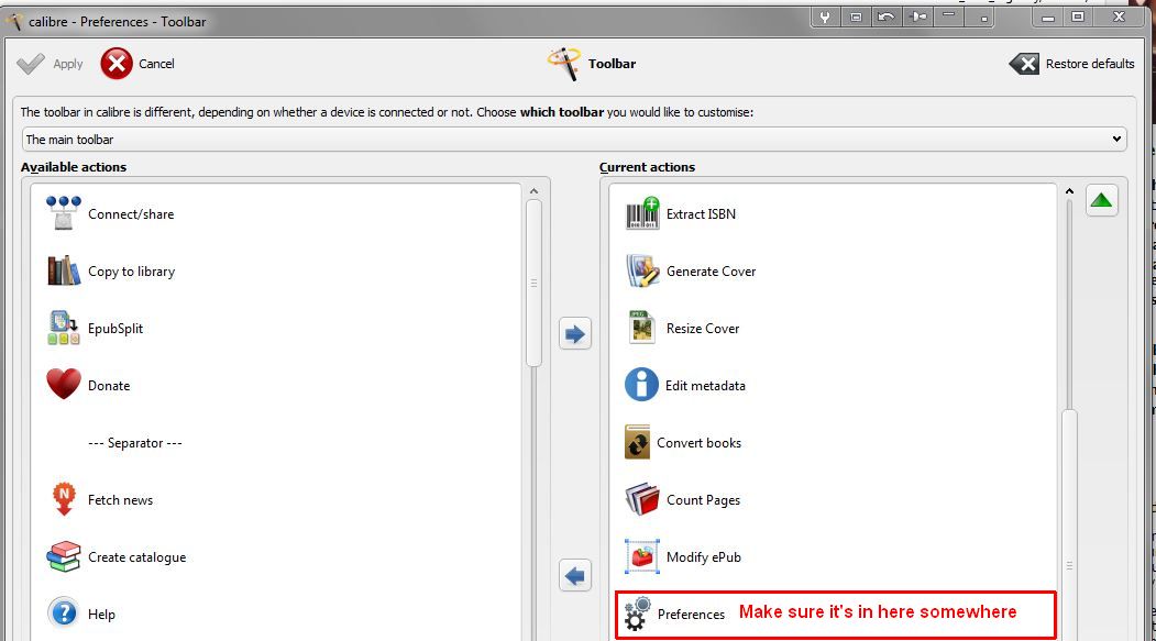 I have just got a Mac Air and downloaded Calibre for Mac, but the Preferences icon is lacking (differently from PC). Any suggestions of how to solve this? |