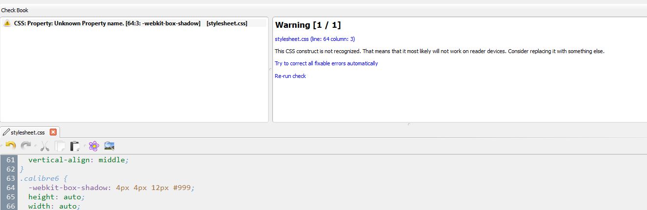 My latest was learning how to make a epub catalog. I loaded the resulting epub into the editor. Running Check throws a CSS warning (screen shot) It's not a biggie but I was thinking that the catalog-generating CSS might be changed to replace the webkit or maybe someone could give me the CSS to change I'm not even sure what a webkit means ![]() Thanks |