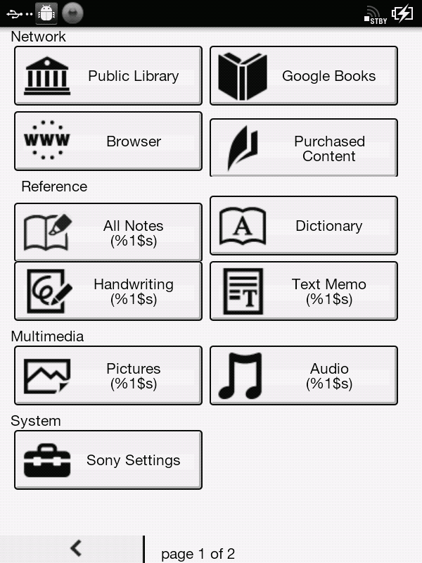 The Sony's launcher is not bad, looks very nice, but it's limited to all things Sony. No access to Android Settings, no "Add Drawer", no support for ebook file types other than the ones already supported by Sony (epub, rtf, txt). Basically, my ideal launcher would look like Sony, but with access to those extra features, i.e. App Drawer, File Manager, book type selection... |