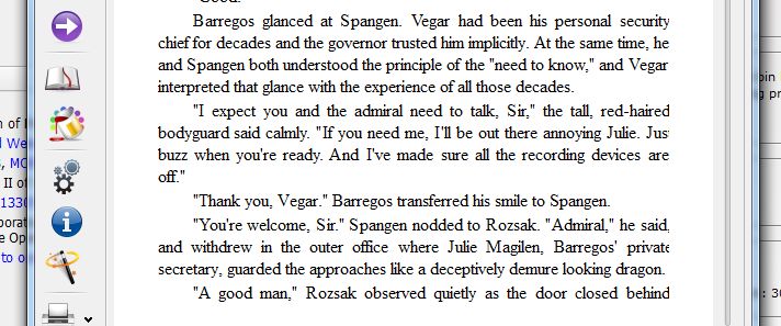 Environment is Windows 7 Professional, Calibre 1.42 Portable. I started with an ePub downloaded from Baen. (Interestingly, it had six style sheets each with a name containing "calibre".) I created a new ePub using the larger right margin value given by HarryT. Also created a Mobi file with the same output values. I couldn't identify which subforum, if any, should be used. If this post is in the wrong place, please pardon me. |