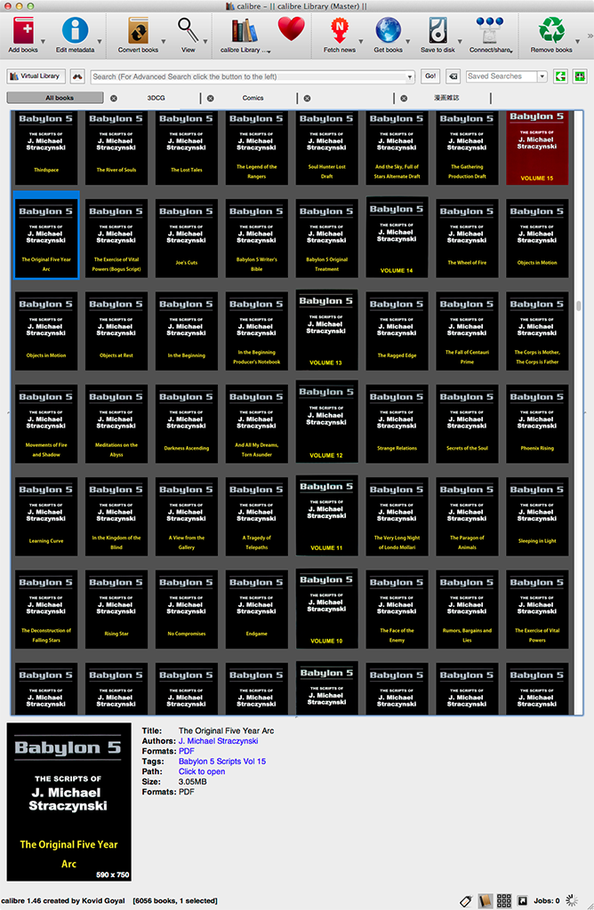 If my calibre window is full size on my secondary screen (1050 x 1680, portrait mode) all is well. But if I move the calibre window to be full size on my main screen (2560 x 1440, landscape), the cover grid will intermittently not display. Screenshots below. Also, calibre gets quite sluggish when in this state, not responding to clicks for several seconds. Sometimes random covers will display briefly but then disappear again. Pull the window back to the portrait screen and all is well again. Switching off cover grid works too. It's not a critical problem, but it was confusing until I figured out that moving the window back to the first screen fixes things. calibre 1.46, Mac OS X 10.9.4, ATI Radeon HD 5870 (1024 MB VRAM) running 3 displays via DVI. |