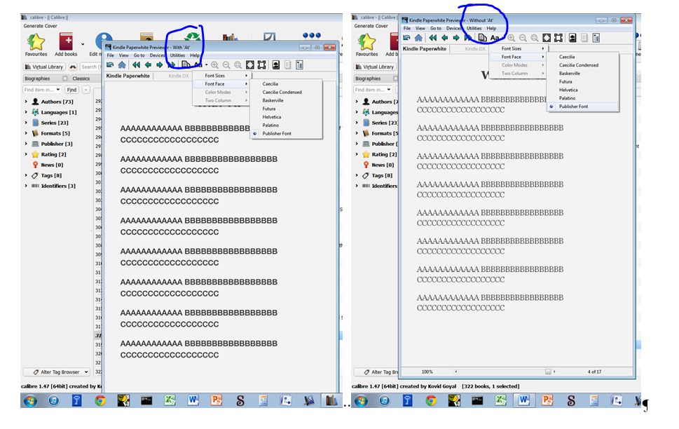 However, in this case the @page was in a comment in a stylesheet with regular text/words following it. The rest of the stylesheet had the @font lines needed to embed the publisher fonts I'm leaning towards a problem on the Kindle side I was thinking that the Kindle was not honoring the comments and trying to actually process the @page command unsuccessfully and caused the style sheet to be ignored, and therefore the publisher fonts also in the failed stylesheet were ignored It appeared to me that adding the space and making it '@ page' would pass the Kindle parser, and then the style sheet would not fail and thus the embedded fonts would be displayable bu using the Kindle Publisher Font. I want to run a simple test to do a little more testing Last edited by phossler; 08-08-2014 at 02:40 PM. |